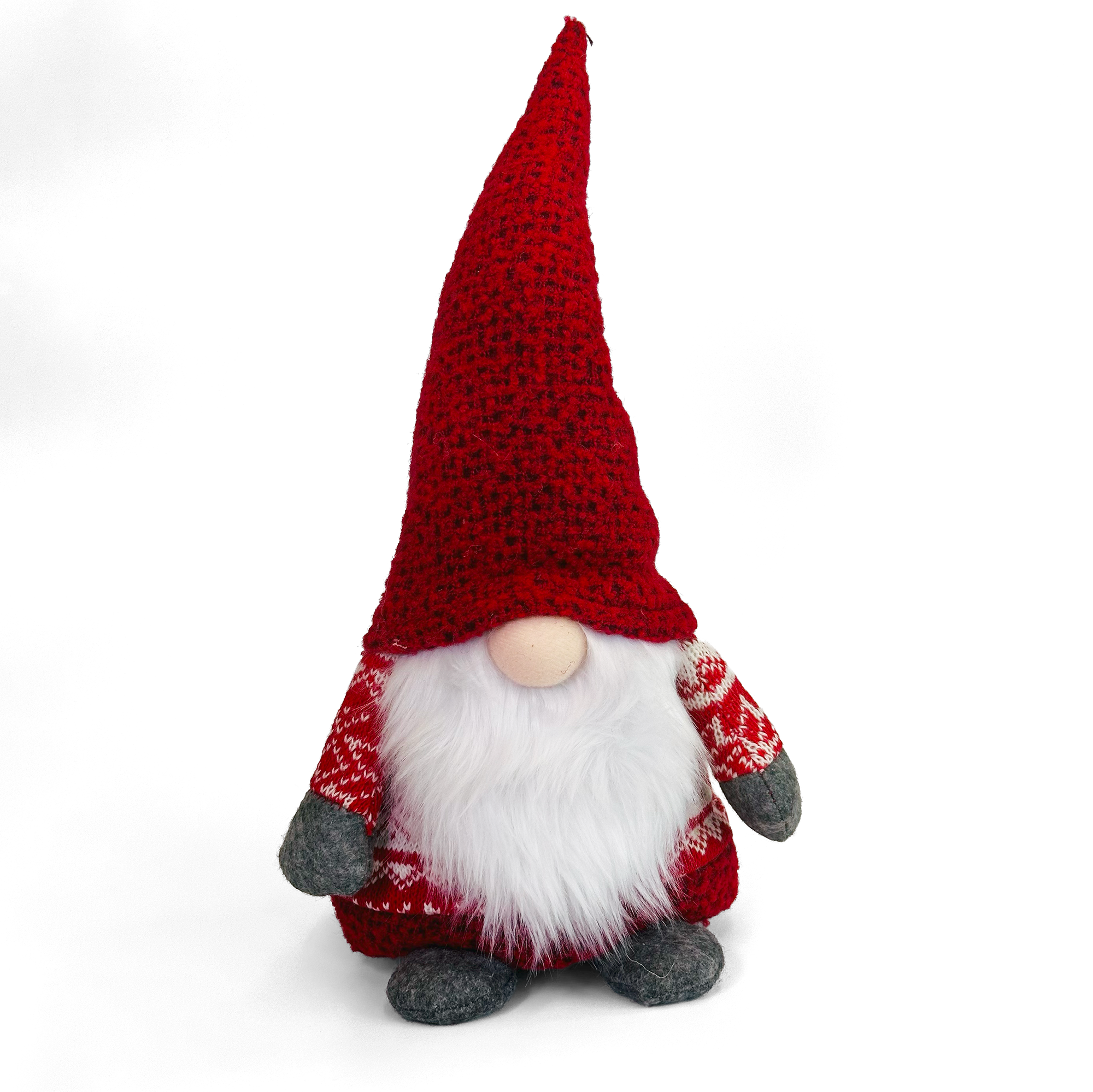 Aivan ihana iso 35cm tonttu-ukkeli punavalkealla neuleella punaisessa lakissaan